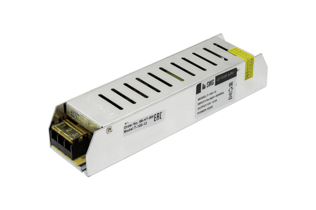 Блок питания УЗКИЙ для LED DFBSL 12В-100Вт- 8.5A (арт.DFB5SL) AC/DC, IP20 мет.кл. (188*46*35) ВЫВОД