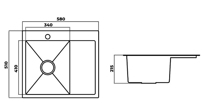 Кухонная мойка из пищевой нержавеющей стали марки 304 толщиной до 3 мм. Мойка прямоугольная, 58х51 см с чашей размером 34х41 см, глубина чаши 195мм. Звукопоглощающая обработка: серая обливка всей поверхности плюс дополнительные виборопоглощающие наклейки.