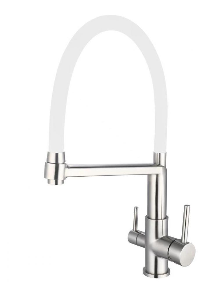 Смеситель кухонный однорычажный с высоким поворотным изливом 2 типа отделки: хром, матовый хром H = 290 (размер по вертикали) L = 190 (размер по горизонтали) классический дизайн стандартное отверстие под смеситель ø 35 мм - керамический картридж высокий поворотный излив материал: латунь гарантия – 2 года Гибкая подводка для воды в комплектацию не входит, приобретается отдельно.