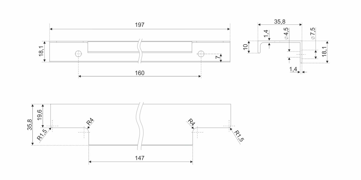 Ручка имеет богатую палитру цветовых решений и разнообразие длин. В зависимости от длины, модель допускает размещение двумя способами — «в размер» фасада и по центру широких фасадов (как большой «язычок»).