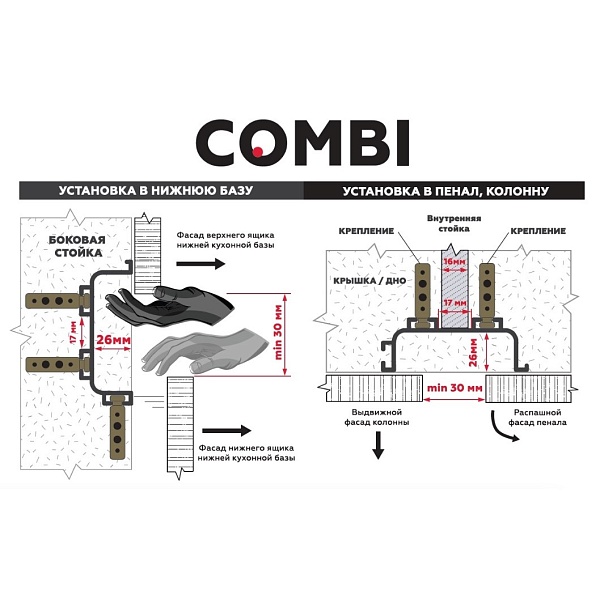 Алюминиевый профиль для кухонных баз устанавливается непосредственно в кухонный корпус, не требует фрезеровки или покраски фасадов. Благодаря захвату с обратной стороны — на лицевой поверхности фасадов не остается следов от пальцев.